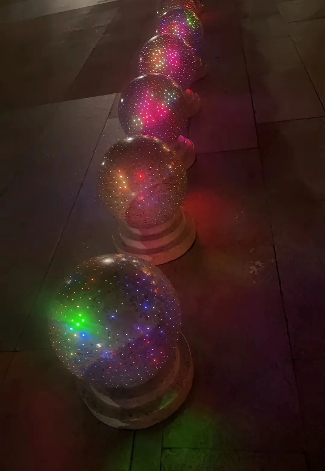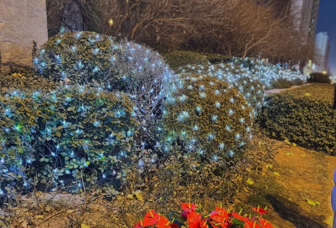 对想拉满城市对比度的山西人,缠树只是开始。户外挂灯原则是能挂必挂,创造条件也要挂。树下花花草草也不放过,绿化带变彩灯带。