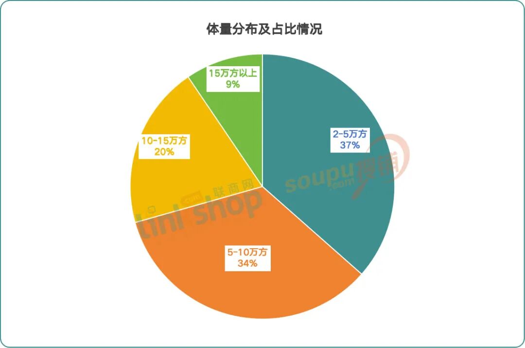 5-10万㎡区间:占比34%,以区域型购物中心为主,是市场供应的中坚力量。