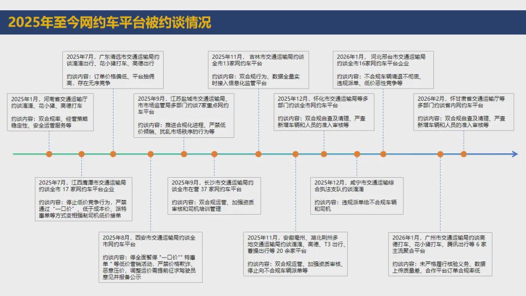源媒汇初步统计,2025年以来,多地交通运输部门对重点网约车平台的约谈次数达11次,约谈内容基本围绕车辆与司机双资质合规、平台资质审核、低价竞争及合规数据失真等问题。