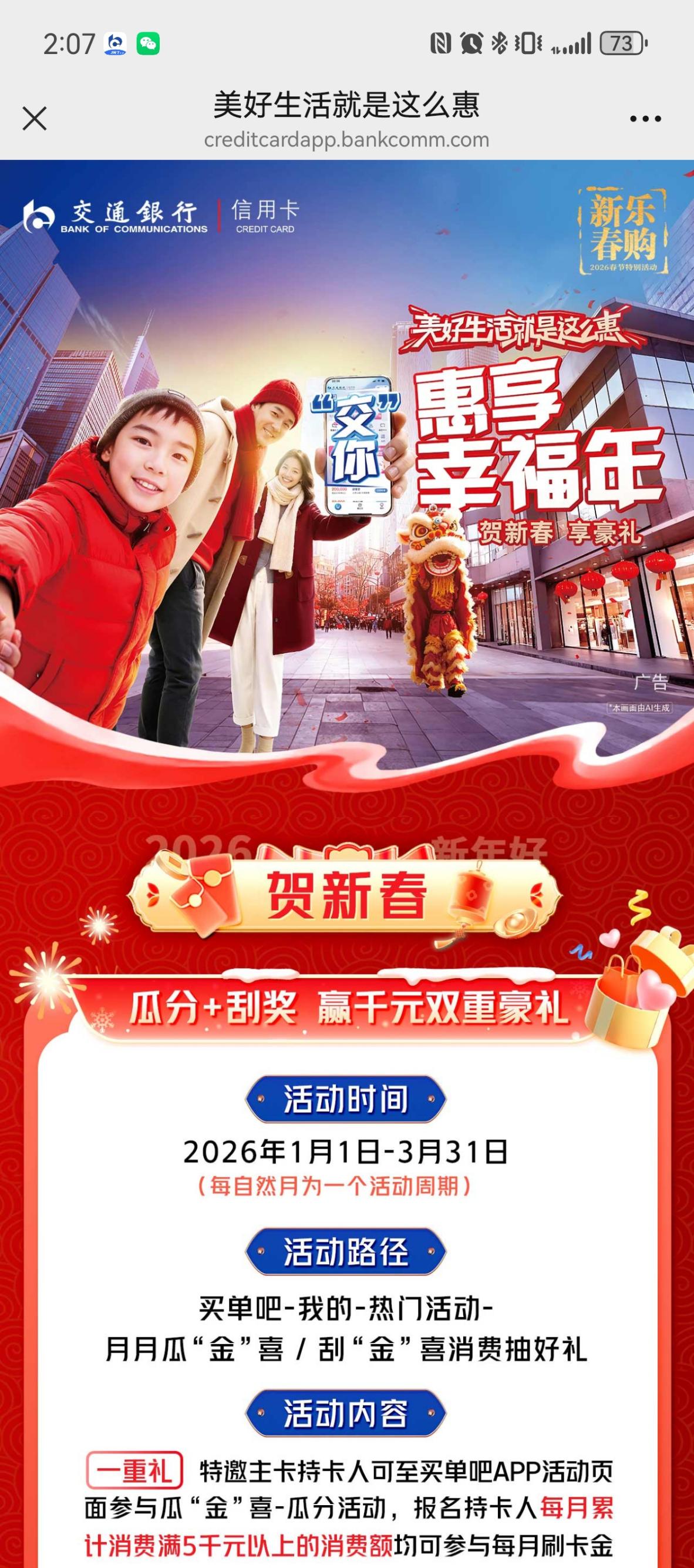 这一举措不仅是交通银行信用卡场景化营销系列的重要行动,更是积极响应国家2026年“乐购新春”促消费活动号召的具体体现。交行信用卡围绕“扩内需、强信心、优供给”的主线,聚焦“吃住行游购玩”六大场景,致力于推动金融服务与日常生活的无缝衔接,持续加强品牌与客户之间的情感交流。