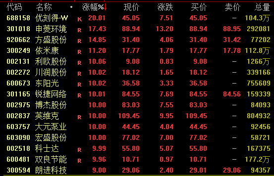 液冷服务器概念板块当日强势上涨,截至收盘,优刻得20%涨停;申菱环境涨超17%,盘中一度涨停并创历史新高;依米康涨超10%,博杰股份、英维克、双良节能等均涨停。