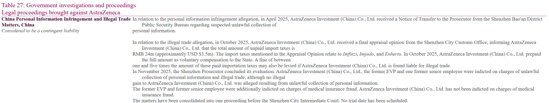 2025年11月,深圳市检察院完成相关评估工作,阿斯利康中国、前执行副总裁及一名前高级雇员被指控非法收集个人信息和非法贸易,不过阿斯利康中国未被指控通过非法收集个人信息获利。而王磊等前高管还被额外指控医保诈骗,阿斯利康中国未涉及此项指控。根据阿斯利康2025年年报,这些案件已合并至深圳市中级法院进行审理,目前开庭时间尚未确定。