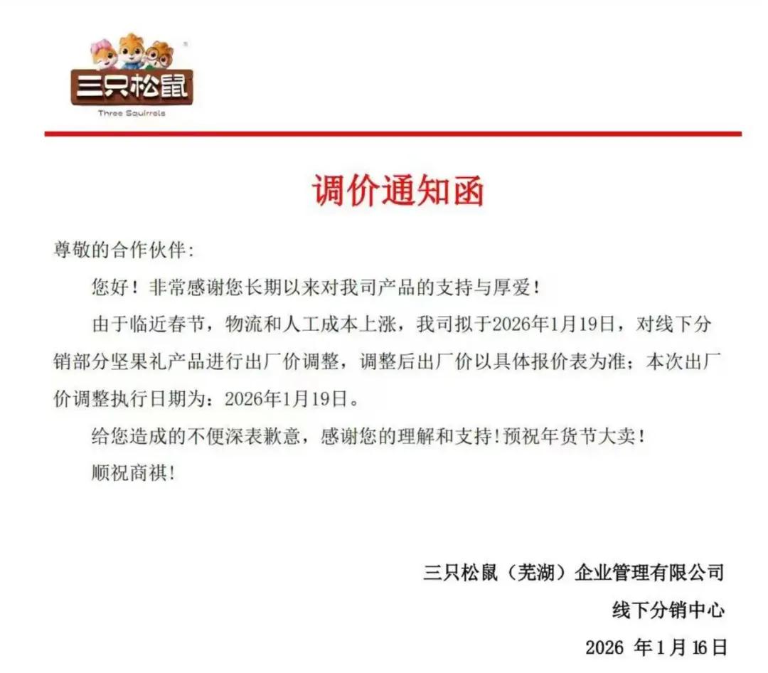 以三只松鼠为例,此前部分坚果礼盒出厂价上调,但品牌方为维持市场竞争力,允许甚至要求“终端零售价不一定涨”。