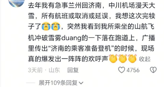 济南暴雪致全城交通瘫痪时,其他航司忙着取消航班,山航飞机却在大雪里“悄悄”滑上跑道,几秒后冲上云霄。网友总结:“只要天上不下刀,山航永远不迟到”。
