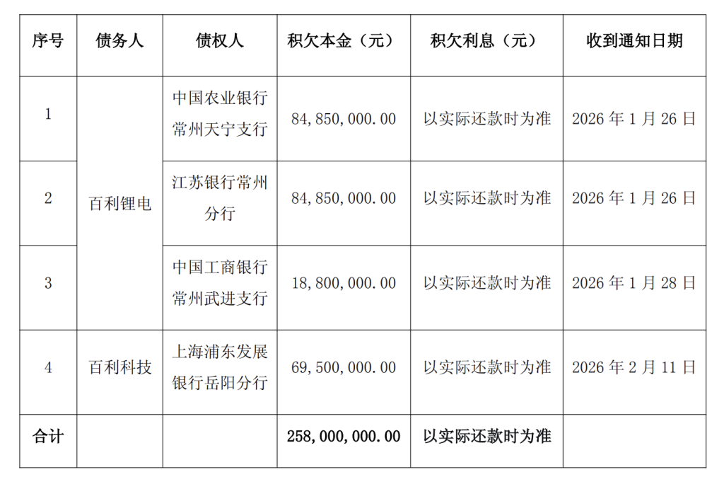 公告内容显示,百利科技及其控股子公司常州百利锂电智慧工厂有限公司(以下简称“百利锂电”)近期接连收到中国农业银行常州天宁支行等多家银行送达的《贷款提前到期通知书》。由于公司和百利锂电出现了未按时足额支付利息等情况,这些银行按照相关合同的约定,宣布合同项下的贷款提前到期,并要求立即偿还所欠的本金和利息。