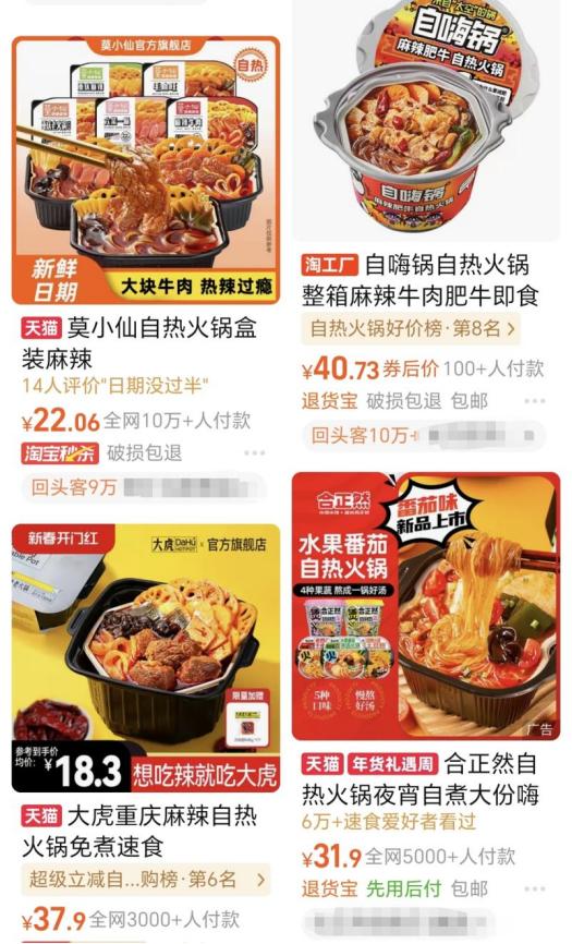 很多自热火锅价格不低,同等价位完全可以选更适口的食物。(图/电商平台截图)