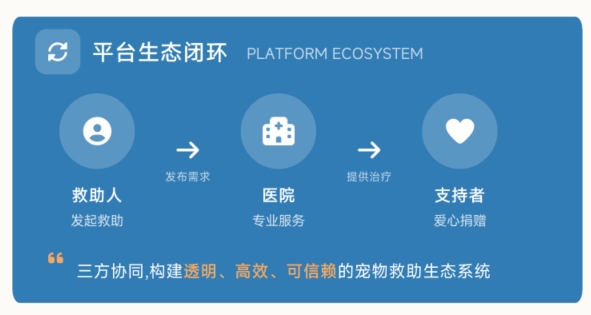 该项目的核心创新点在于构建了“救助人-医院-支持者”三方协同的生态闭环。平台严格落实“三大透明原则”:救助信息全程可追溯、资金流向实时公示、救助流程标准化记录,有效解决传统救助模式中信息不透明、资金监管缺失等痛点。同时,平台深耕宠物医疗垂直领域,凭借对行业需求的精准把握,提供从发起救助、医疗对接至社会筹款的全流程数字化方案,大幅提高救助效率与公众参与度。