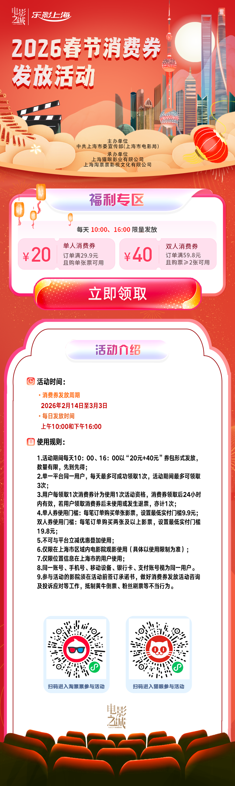 2026年“乐影上海”春节电影消费券将于2月14日正式上线,真金白银送实惠,春节档所有影片均可使用该消费券抵扣,全市320余家影院通用。有了这份福利,大家无需纠结,放心观影,轻松实现“春节档观影自由”。