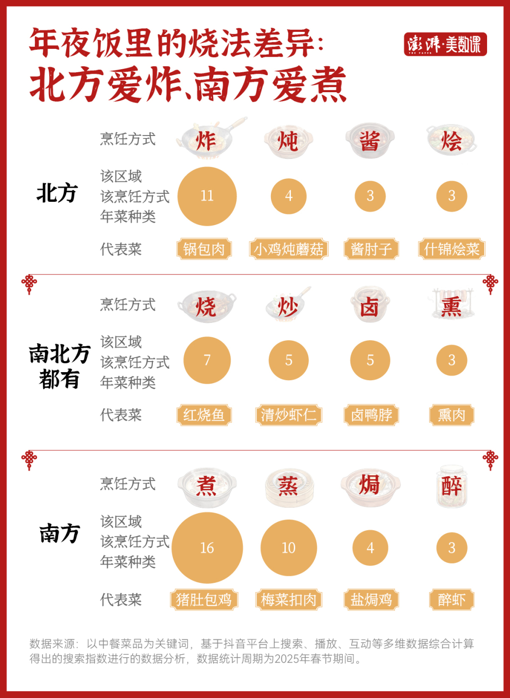 除了食材偏好,各地烹饪方式的不同也深刻影响着年夜饭的代表菜。