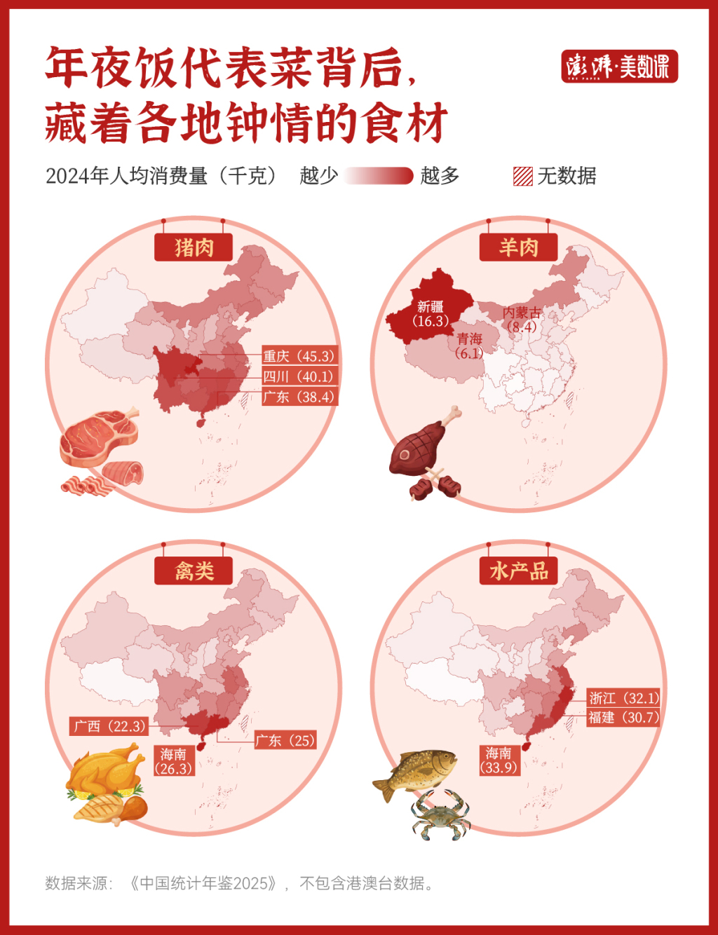 比如海南的文昌鸡、两广的白切鸡,这些地方的除夕餐桌上肯定少不了禽类食材。2024年,海南、广东、广西的人均禽肉消费量分别为26.3千克、25.0千克和22.3千克,位居全国前三。