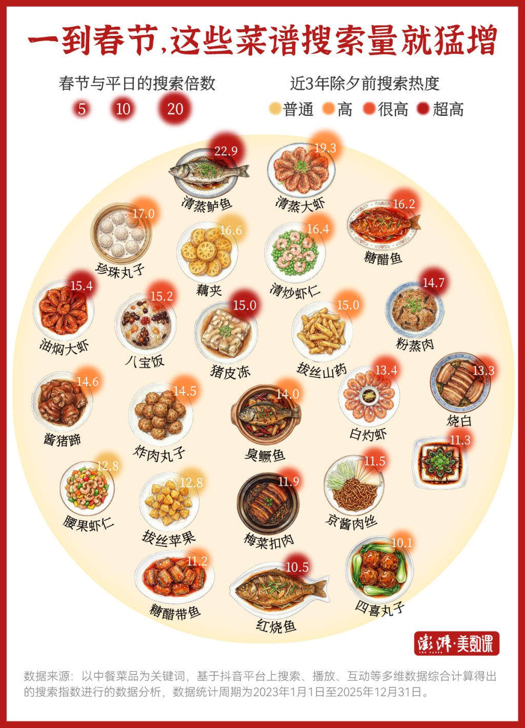以春节与平日搜索指数比例达10倍为标准,我们找出了年夜饭中大家高频关注的菜品。