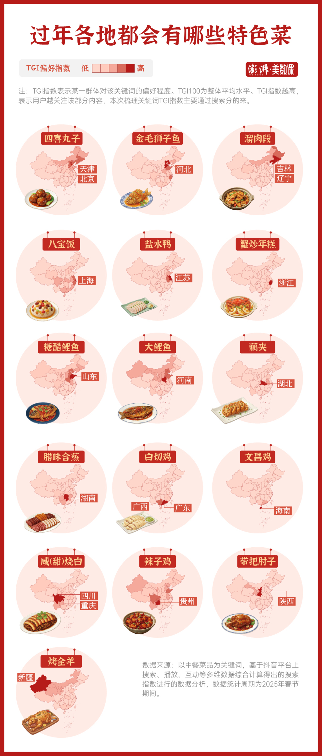 而在离海较远的中西部地区,猪牛羊肉作为过年硬菜的比例更高。川菜全国闻名,年夜饭里让人垂涎的菜品数不胜数,但要说哪道菜最不可或缺,恐怕还是烧白。春节期间的TGI指数显示,四川和重庆在咸烧白和甜烧白的搜索偏好度上遥遥领先。