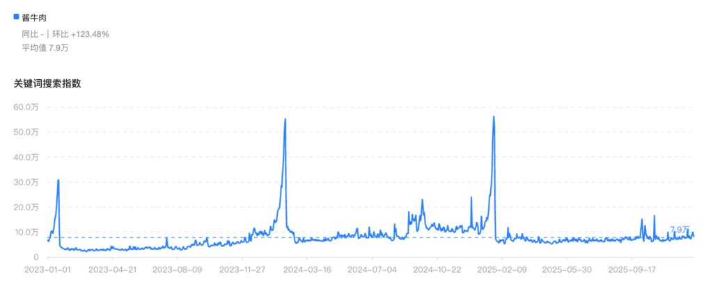 例如在社交平台上可以看到,过去3年里,临近除夕夜的前几日,酱牛肉的搜索指数急剧上升,是平日搜索量的7.6倍。