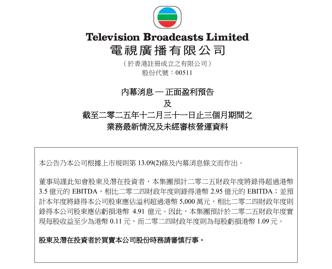 近期,电视广播有限公司(简称:电视广播;英文简称:TVB;000511.HK)发布业绩盈利预告,预计2025财年盈利超5000万港元,同比实现扭亏,而2024财年公司亏损达4.91亿港元。同时,公司预计2025财年EBITDA(息税折旧及摊销前利润)超3.5亿港元,较2024财年的2.95亿港元有所提升;每股收益至少为0.11港元,2024财年每股亏损则为1.09港元。
