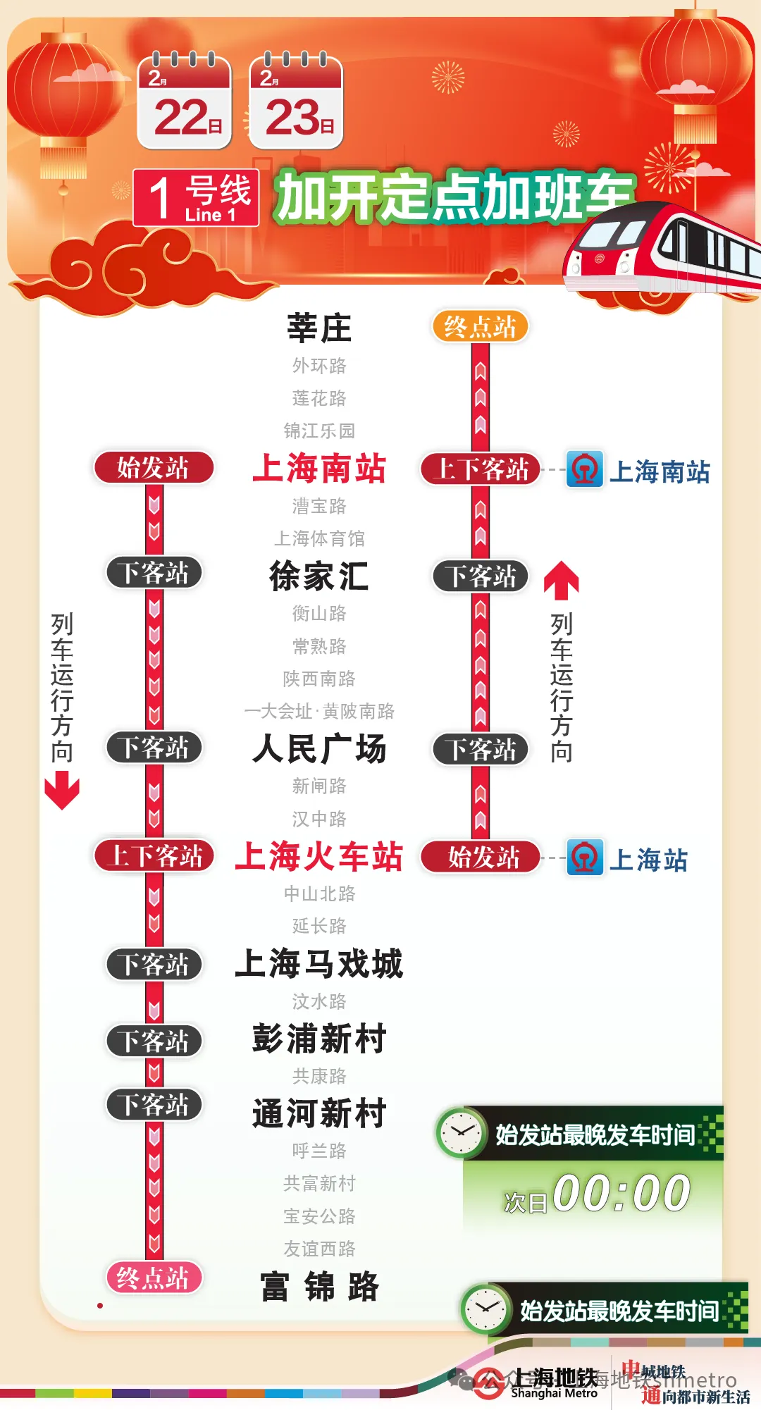 按照计划,春运期间,每逢周日,2号线虹桥火车站站的夜间定点加班车将延长运营至0点。此外,2月21日,2、9、17号线会加开末班车,延长运营至次日0点(其中9号线在23:00和23:20加开的列车,从佘山站起将按照常态延时运营方案执行)。2月22日、23日,1、2、9、10、17号线也会加开末班车,延长运营至次日0点。