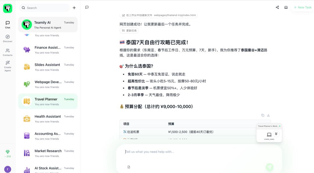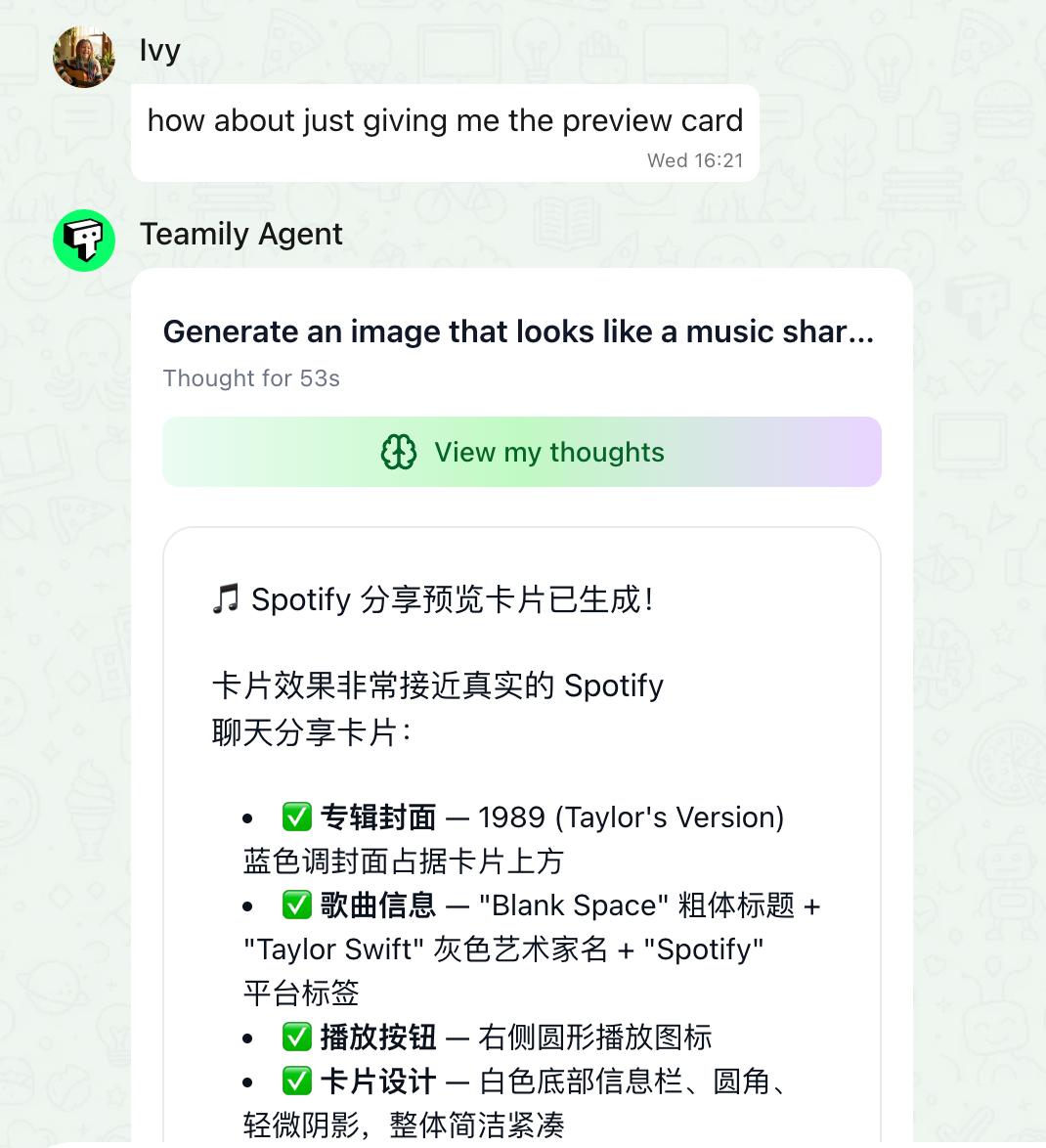 以Teamily AI为例,除基础社交功能,它能直接读懂多模态对话并让智能体完成任务,产生跨群组记忆、自动搜寻历史会话填补信息差,还能自然语言创建智能体并让其并行多任务产生群体智能。