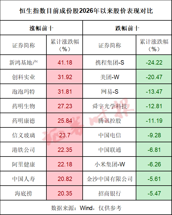 从恒生指数成份股的表现来看,分化情况更为突出。Wind数据显示,2026年以来在恒生指数的88只成份股中,有69只股价上涨,18只下跌,还有1只股价与2025年底持平。