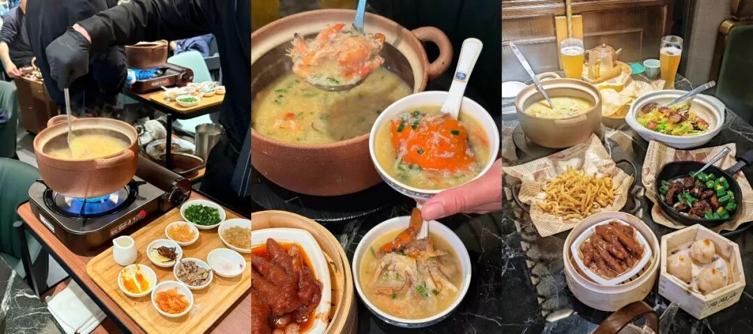 产品上的烟火气更浓。现炒海鲜粥由厨师推餐车到桌边现场制作,点火、下料、翻炒海鲜至红亮,再倒入熬好的白粥煮至滚烂,全程可见火候变化,香气四溢。煮好后,顾客还能添加生蚝、鲍鱼等食材。