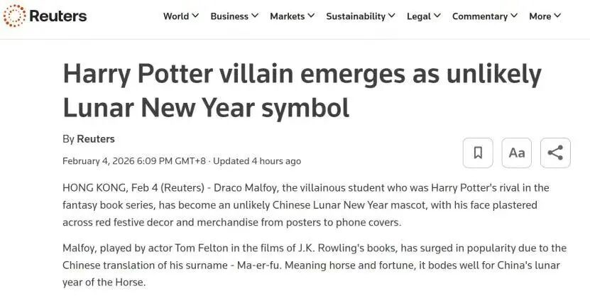 儿童文学学者菲利普·内尔曾指出,马尔福的名字源于法语“mal-”(恶意)和“foi”(信仰),含“恶意”之意,但其中文音译“马尔福”却自带美好寓意,恰好契合马年的吉利元素。译者留下的这枚“彩蛋”,让这位反派摇身一变,成了被贴在门上、制成AI动图送福的新春符号。