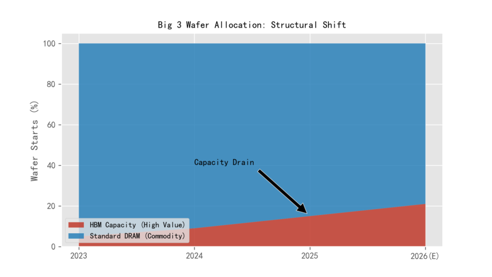 这一技术进展虽稳固了AI算力的供应链支撑,但对存储产业的深层影响远超技术层面。随着平泽P4等核心产线向HBM4倾斜,全球DRAM产能正面临愈发严重的“结构性抽血”。剥离AI增长的光环,通用存储市场的现状显示:HBM产能扩张本质是与通用DRAM(DDR4/DDR5)的零和博弈。