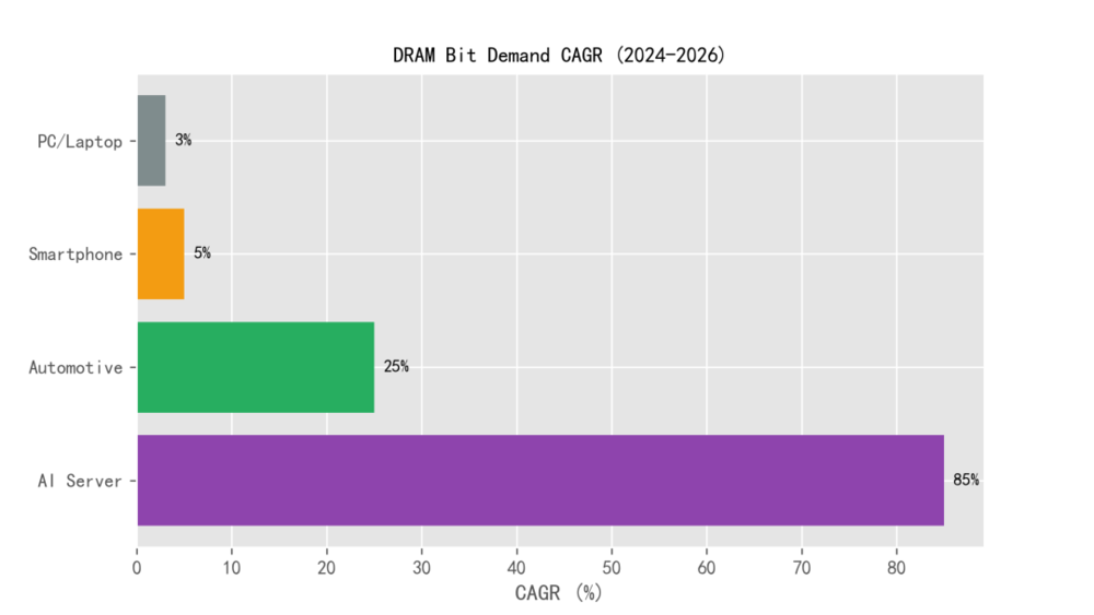 在资本支出有限的情况下,企业逐利本能决定了产能分配优先级。Gartner数据显示,AI服务器对DRAM位元需求的年复合增长率(CAGR)高达70%左右,而PC和智能手机仅为3%-5%。