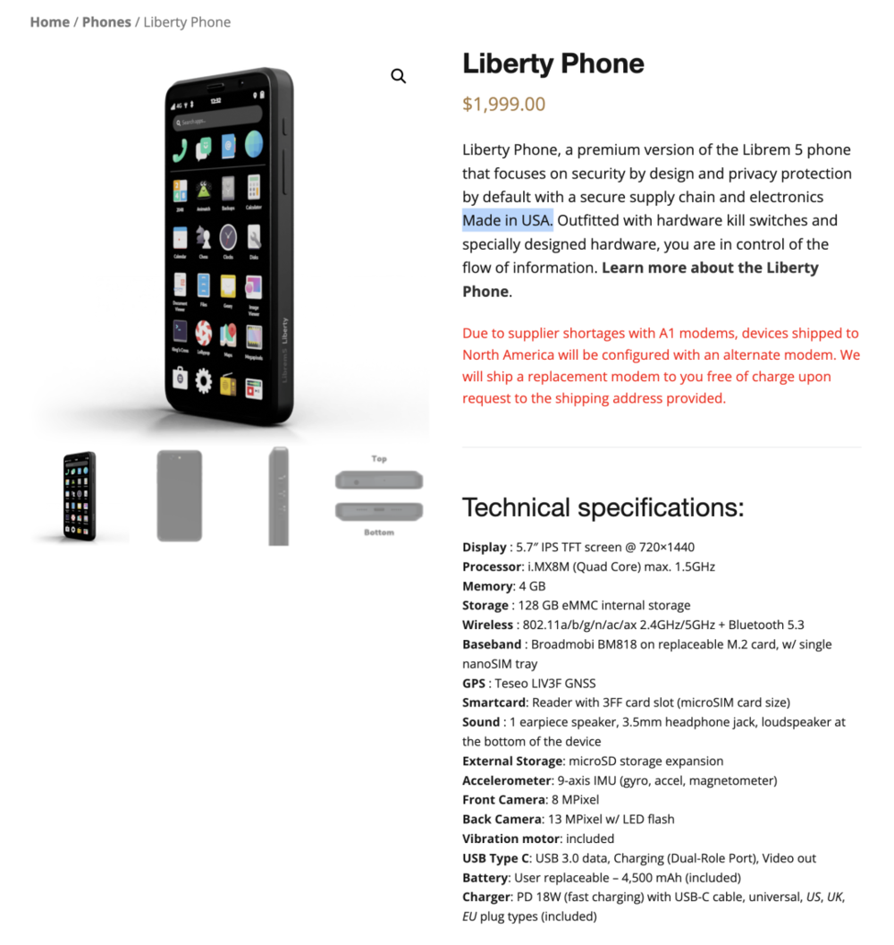 纯美国制造的Liberty Phone虽能出货,却用六年前的配置卖出堪比折叠屏的价格: