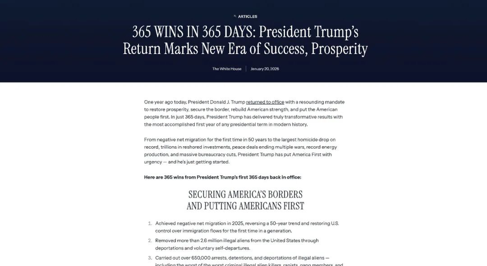 上月,白宫办公室为纪念特朗普二次就职一周年,发布了题为《365 WINS IN 365 DAYS:President Trump’s Return Marks New Era of Success,Prosperity》的长篇报告。