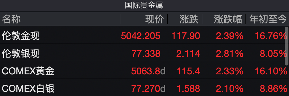 贵金属价格强势回升!现货黄金涨幅超2%重返5000美元关口