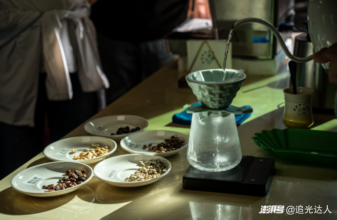 研磨好的咖啡粉放在我面前,第一股香气直接且强烈,随后更复杂的香气层层散发出来。用94度的水缓慢注水,咖啡粉在滤杯中像火山一样隆起,释放出更多的芳香物质。三分钟后,一杯手冲咖啡就完成了,琥珀色的液体在白色瓷杯中显得格外纯净。