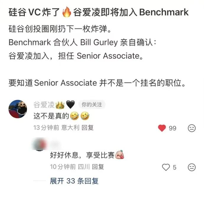 事件最初由一位社交平台博主发布消息,称谷爱凌计划在冬奥会结束后加入硅谷顶级风投Benchmark,担任资深投资经理(Senior Associate)一职。
