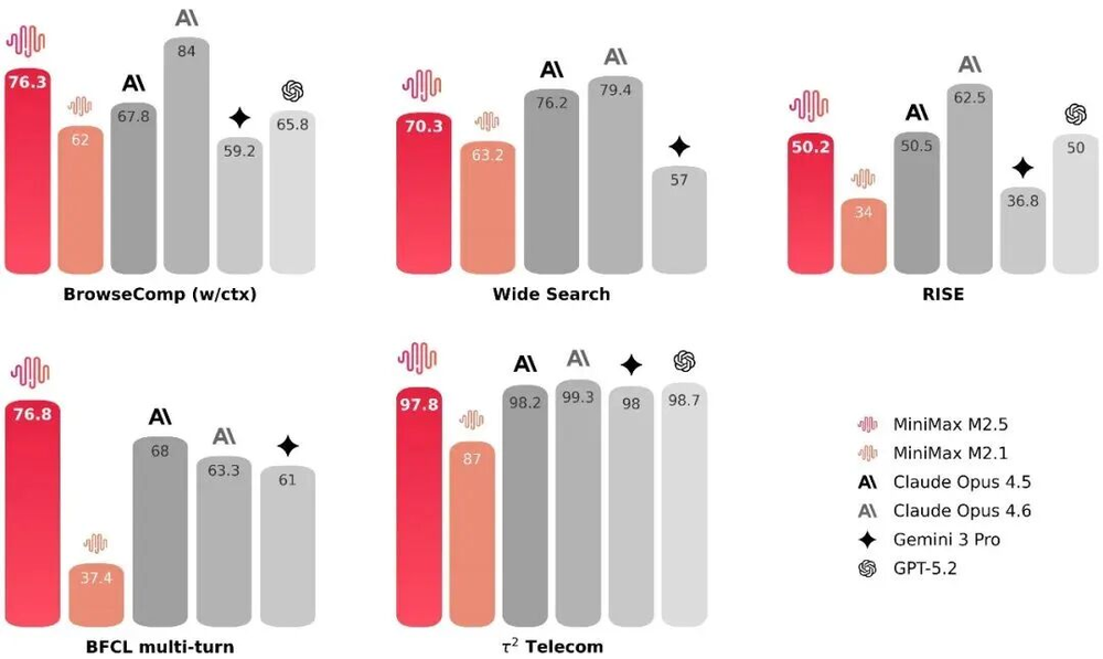 M2.5的工具调用能力十分出色,在多项工具调用指标中均处于领先水平。搜索是Agent最常用的工具之一,为此MiniMax专门构建了评测集RISE(Realistic Interactive Search Evaluation),用于测试模型在真实专业任务中的搜索能力。
