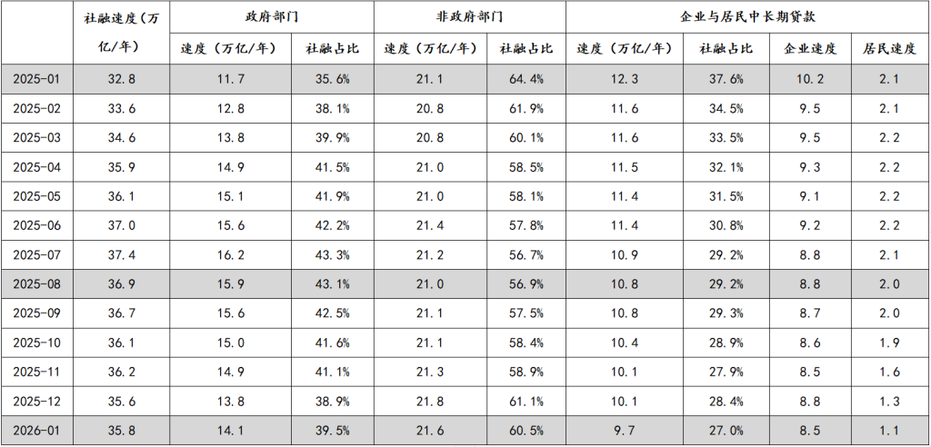 其次,宏观杠杆率升幅保持稳定的核心原因在于政府融资仍是社融投放的主力。财政可持续性约束与债务跨周期平滑需求,共同支撑了这一格局。从社融投放速度看,今年1月达35.8万亿/年,较去年同期增加3万亿,其中政府部门贡献2.4万亿,而企业和居民中长期贷款投放速度下降2.6万亿,政府加杠杆填补实体经济降杠杆的进程仍在推进。