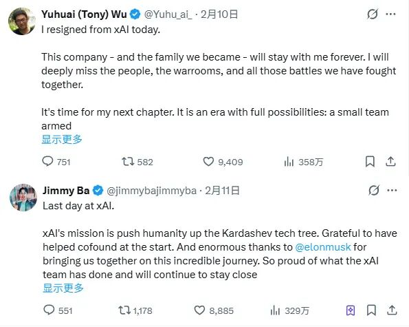 综合外媒报道,2月10日至11日期间,xAI的两名华人创始人——吴宇怀(Tony Wu)与吉米·巴(Jimmy Ba)先后对外宣布离职。这意味着短短一个月内,xAI已失去3名华人联合创始人。
