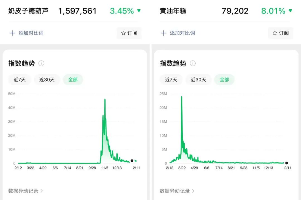 2025年的爆品数量少、热度持续短,创新多停留在形式。从微信指数看,固体杨枝甘露热度仅维持一周,黄油年糕热度顶峰后半个月几乎归零。