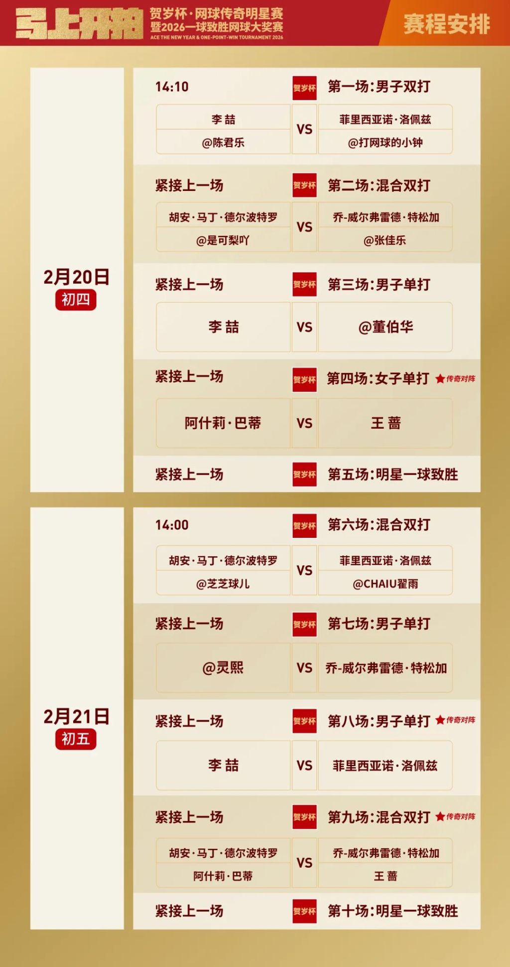 其中,贺岁杯·网球传奇明星赛将有6名网坛传奇选手与8名人气网球达人联袂出战,赛事安排在20日和21日。2026一球致胜网球大奖赛则有512名业余选手参赛,赛程为18日至21日。
