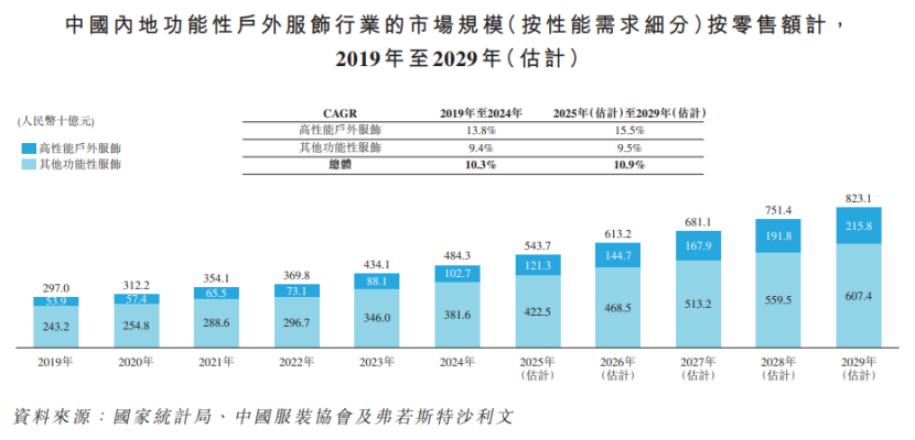 根据相关机构统计,中国内地功能性户外服饰行业市场规模呈逐年扩大趋势,其中高性能户外服饰的增速明显高于其他功能性服饰。2019年至2024年,高性能户外服饰的复合年均增长率(CAGR)达到13.8%,预计2025至2029年将达到15.5%。