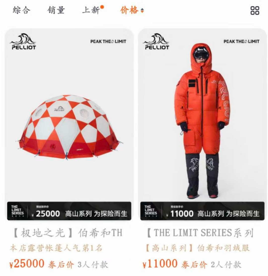 另外,根据品牌官方旗舰店信息,伯希和THE LIMIT SERIES系列球形帐篷最高售价达25000元一顶,甚至高于有“帐篷中的劳斯莱斯”之称的Hilleberg的大部分产品;该系列的高山探险连体款羽绒服,售价也达到11000元,与始祖鸟、加拿大鹅等高端户外品牌价格相当。