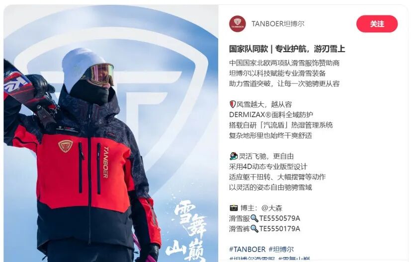 由于缺乏深厚的专业户外基础和广泛的大众影响力,一心向高端发展的坦博尔等品牌希望借助与国家队合作、专业赛事赞助或联名、国际奖项等第三方背书,以行业内部认可的专业形象,证明其品质可与国际品牌和国内行业头部品牌相媲美,而非仅仅依靠营销来抬高价格。
