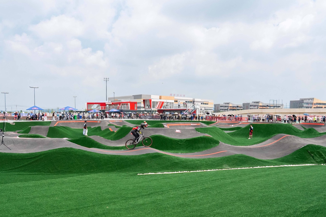 新建的乐享运动体育公园,除了儿童区还有赛事区。那是一片泵道场地,它可不简单——是按照国际自行车联盟(UCI)标准建设的。就在过去几个月,2025中国泵道自行车联赛乳山站已在这里成功举办。