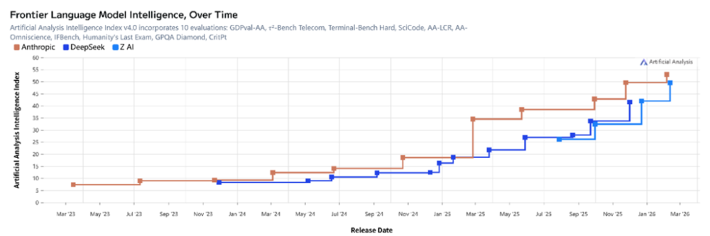 (根据ArtificialAnalysis,当前美国最强模型来自Anthropic,中国最强模型来自智谱)