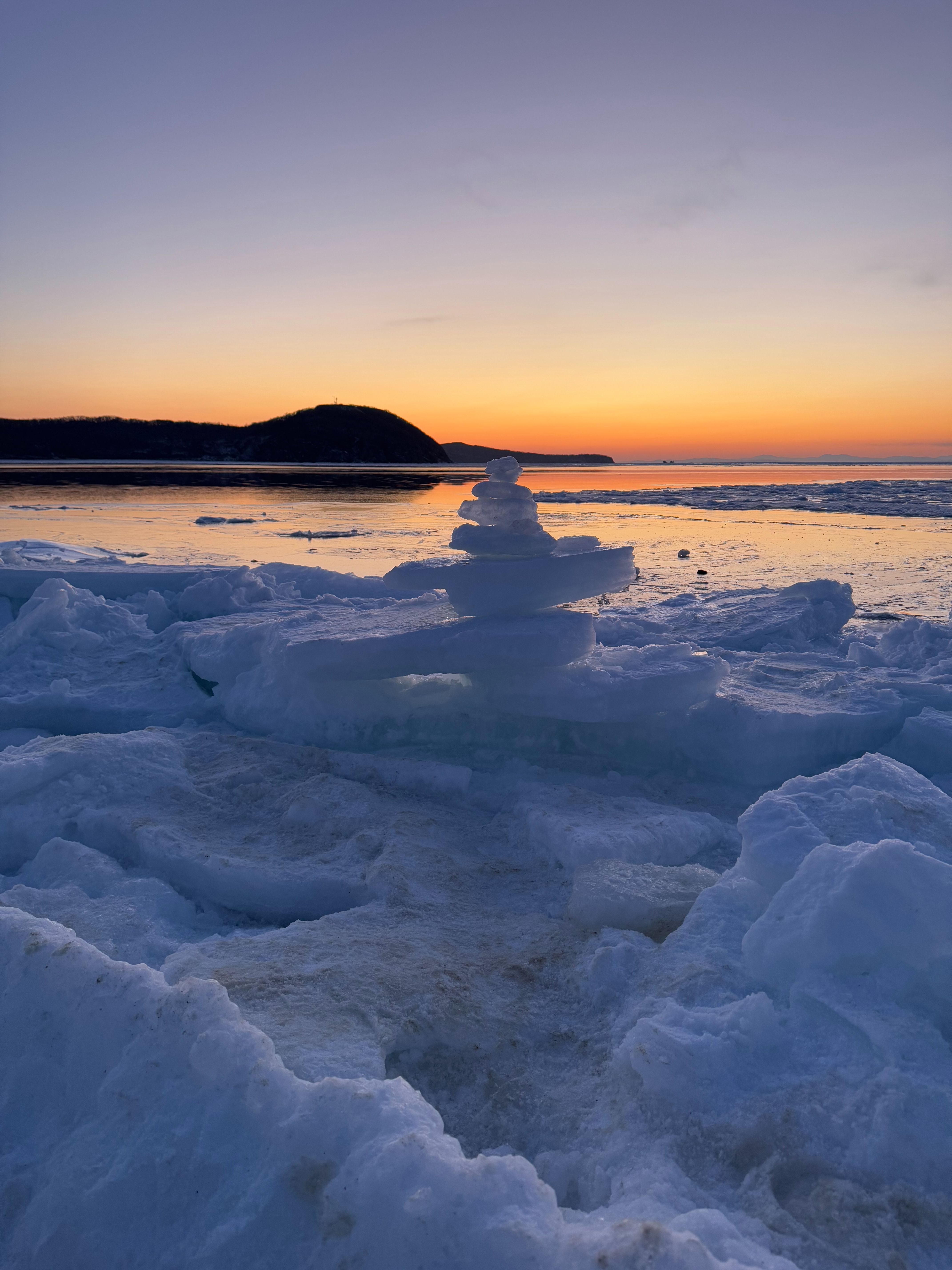 托卡列夫灯塔是《七月与安生》取景地,来海参崴必打卡。我到的时候天已暗,冬天的雾气裹着灯塔暖黄色灯光,照在岸边冰面上,又冷又有氛围感。沿砂石路往灯塔走,脚下的冰特别结实,蹦跶几下都没事。偶尔能看到几只海豹躲在冰缝里,隐隐约约。风刮在脸上像小刀子,带着海冰的咸味儿,清清爽爽,却让人顿生孤独感。