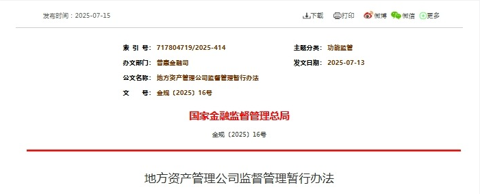 2025年7月15日,《地方资产管理公司监督管理暂行办法》(金规16号文)正式发布,文件明确指出银保监办发【2019】153号文同时废止。这意味着地方AMC行业首个纲领性文件完成历史使命,万亿规模的地方AMC机构迎来监管升级,同时新政策也暗藏业务新机遇。