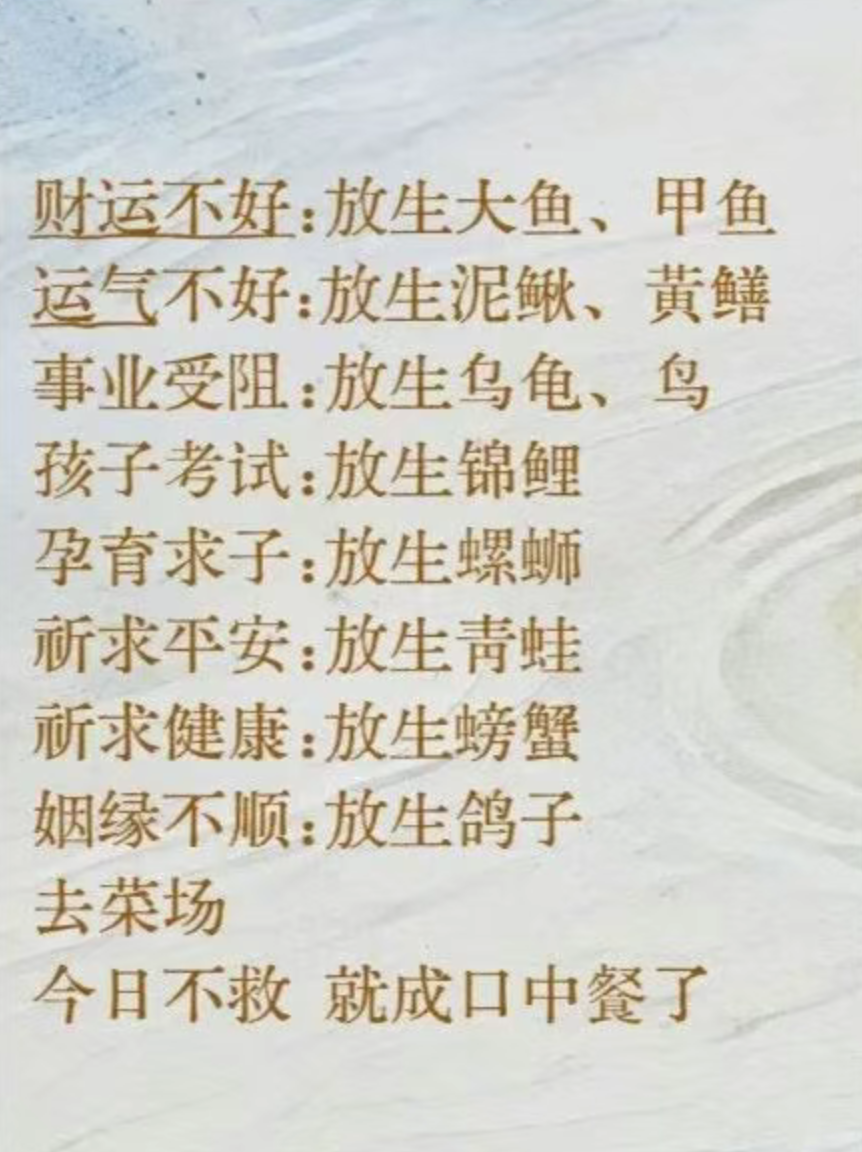 此外,放生成为情绪宣泄出口,而非道德行为。现代生活节奏快、压力大,放生流程固定,能给人强烈控制感与心理安慰。相比戒色、戒赌、素食等高强度自律,放生门槛低、情绪价值高:“买鱼放生”易计数、易完成,能带来“功德到手”的踏实感;而长期自律需抵御诱惑,难度显而易见。且放生包容性强,无论男女老少、自律是否成功,都能参与,即便其他方面受挫,一次放生也能缓解愧疚,因此人们愈发忽视其本质,只求情绪发泄。
