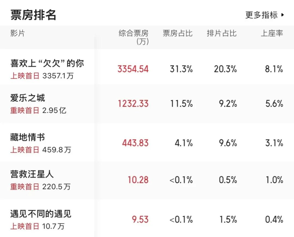 《喜欢上“欠欠”的你》首日票房3354.54万元,票房占比31.3%,排片占比20.3%;《爱乐之城》重映首日票房1232.33万元,票房占比11.5%,排片占比9.2%;《藏地情书》首日票房443.83万元,票房占比4.1%,排片占比9.6%;其余如《营救汪星人》重映、《遇见不同的遇见》等影片的票房与排片占比均低至可忽略不计。