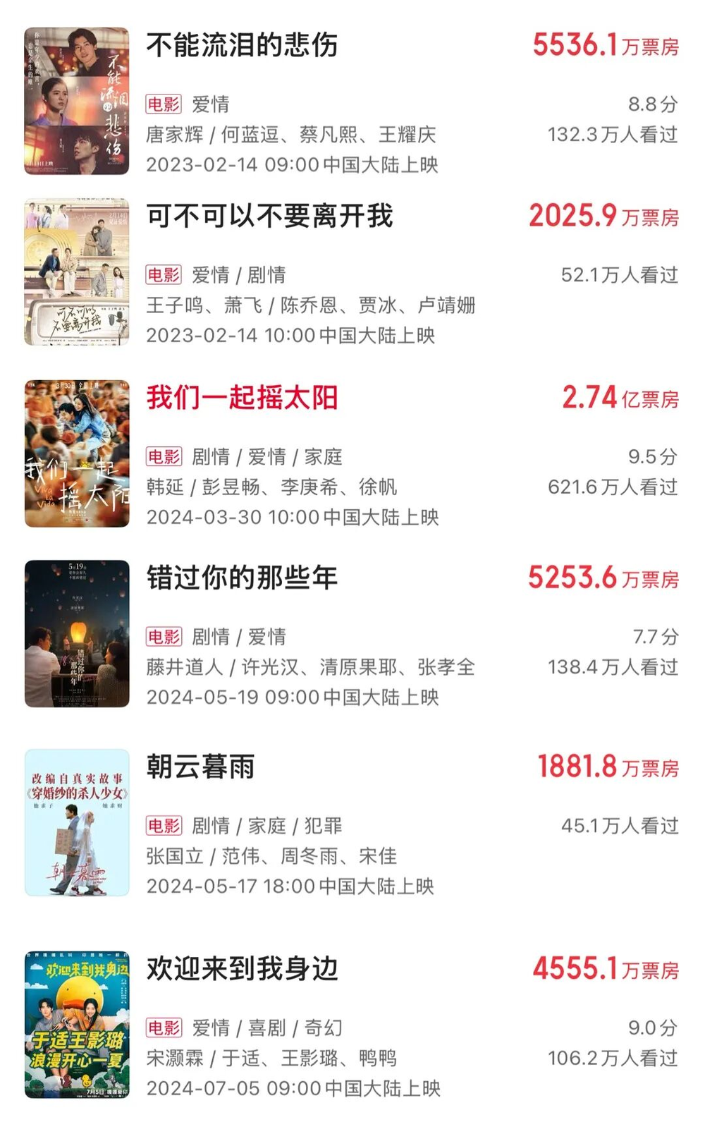 2022年情人节档,《十年一品温如言》《好想去你的世界爱你》《不要忘记我爱你》三部国产爱情片被观众戏称为“烂片三连”;2023年,同档期影片票房仅维持在数千万元级别;2024年,《我们一起摇太阳》选择挤入春节档,却在激烈竞争中撤档,同年“520”“七夕档”的爱情片票房也未有起色;2025年情人节档,仅靠《花样年华》重映支撑,“520”是《情书》重映,七夕档则被《捕风追影》《浪浪山小妖怪》抢占关注度;2026年情人节档,《喜欢上“欠欠”的你》的表现仍未突破近年同档期平均水准。