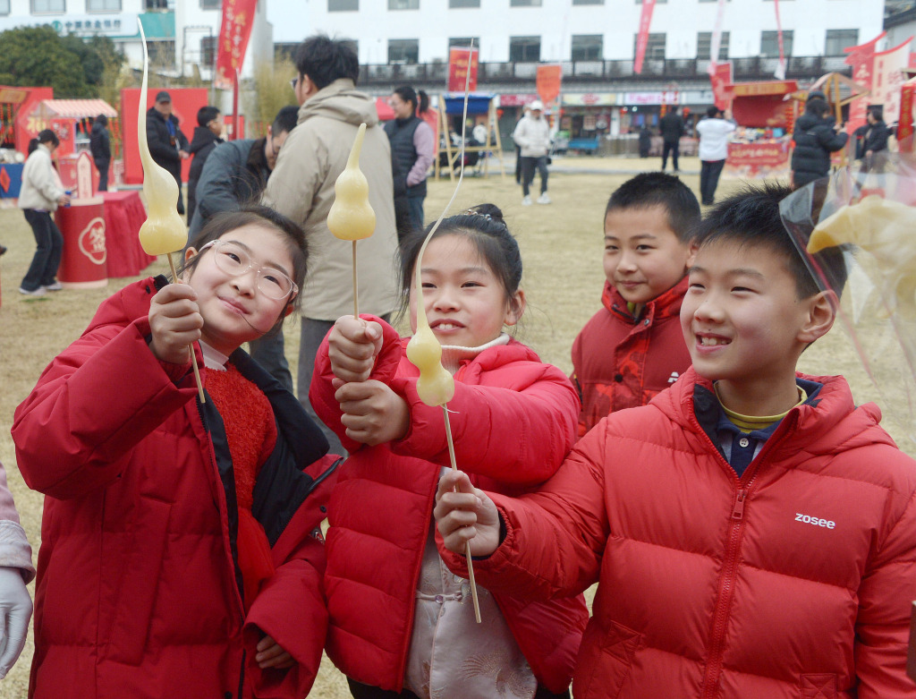 2026年2月10日,上海朱家角古镇,小游客体验吹糖人这项非遗技艺。视觉中国 图
