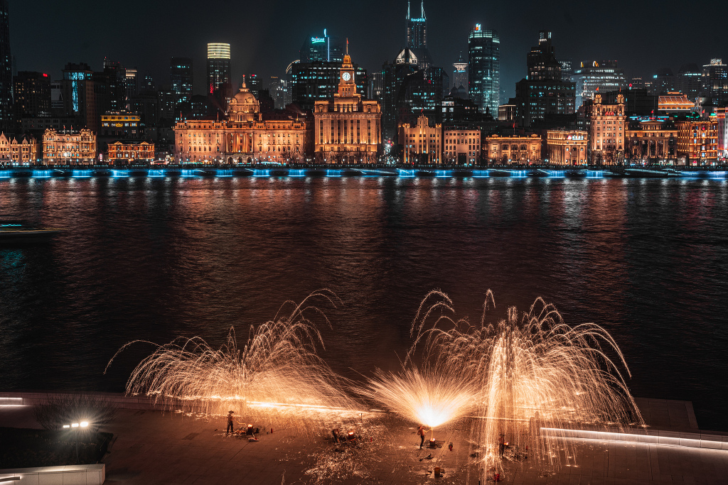 2026年2月4日,上海浦东美术馆内,非遗传承人表演打铁花技艺。视觉中国 图