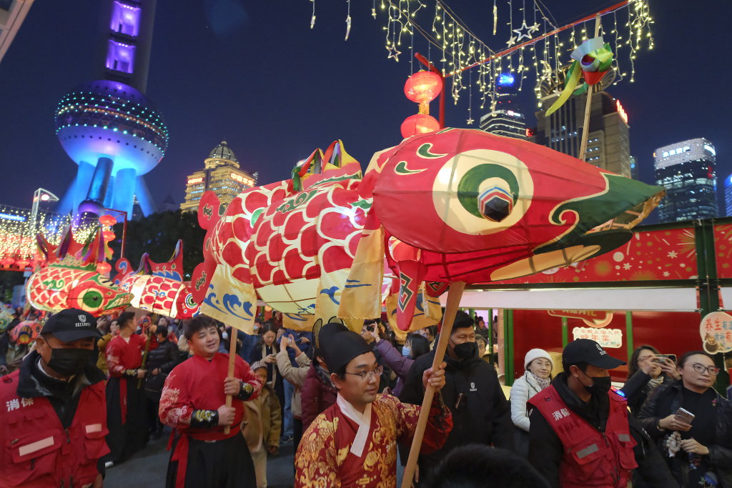 泗泾古镇点亮灯彩后,上海市宝山区罗店暖春灯会、嘉定区州桥老街鱼灯巡游等活动相继开展。黄浦区的豫园民俗艺术灯会、虹口区“今潮8弄”弄堂灯会、闵行区莘庄灯会以及分布在各商圈、园区、街区的灯会也陆续点亮。