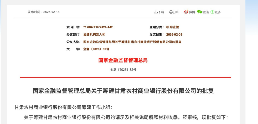 2月13日,国家金融监管总局发布批复文件,正式同意筹建甘肃农村商业银行股份有限公司(简称“甘肃农商银行”)。