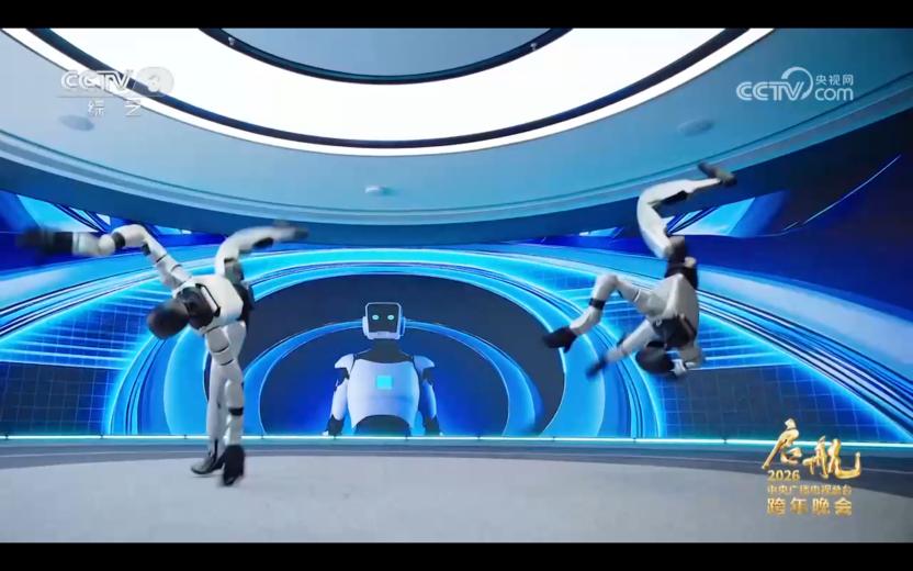 在《启航2026》跨年晚会上,宇树G1机器人就与演员合作表演歌舞,将Locking街舞动作与前空翻、踢腿等高难度动作融合,展现出进化的姿态。